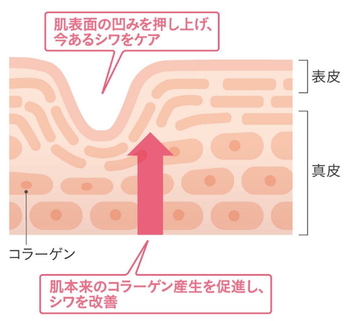 角層のバリア機能を整え肌をやわらかくしながら、弾力の源である「コラーゲン」の産生を促進し、加齢によるシワを改善します。深いシワ予備軍の乾燥による小じわにもしっかり対応1!